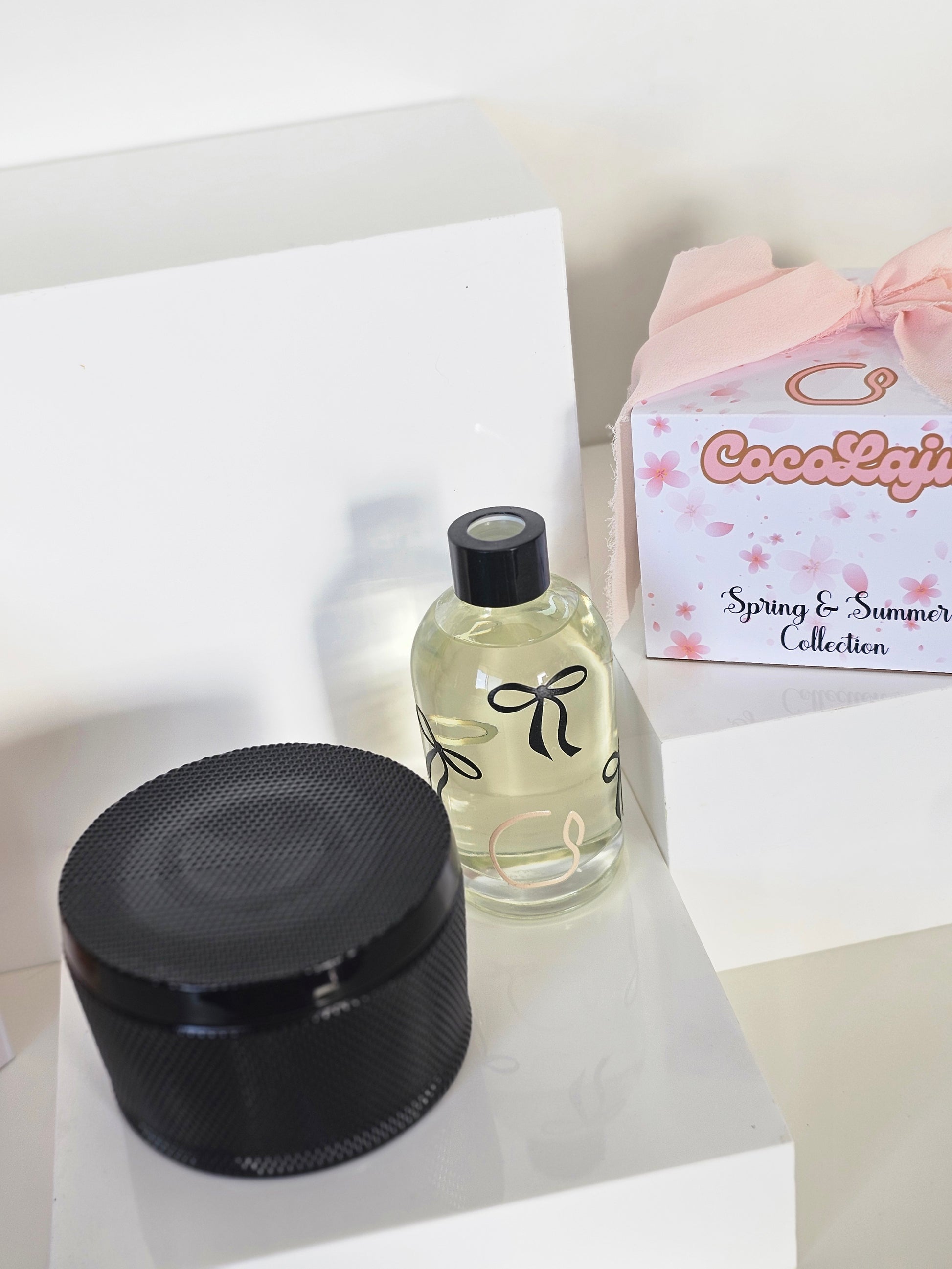 The sleek black jar with satin shimmer combines perfectly with a diffuser filled with dry florals and finished with a colorful bow, creating a luxurious, long-lasting scent experience that’s both dramatic and refined.