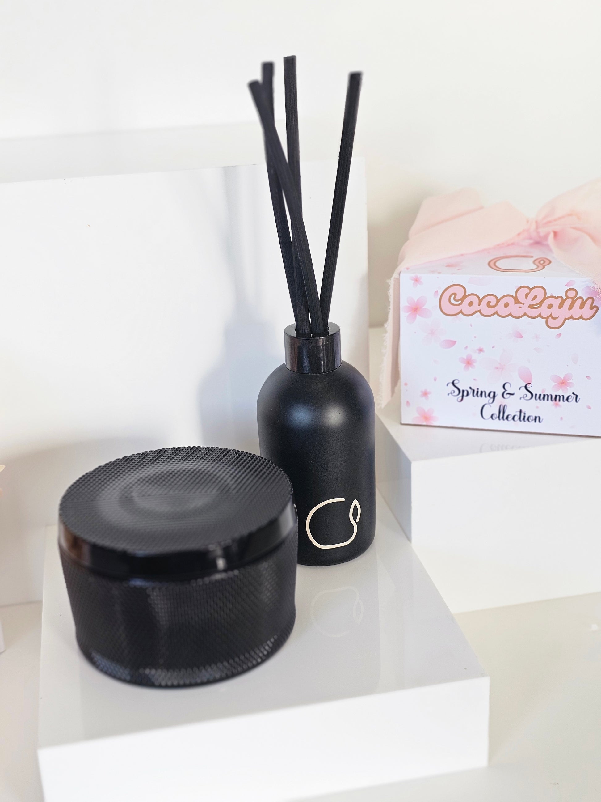 Make a bold statement with the Black Satin Candle Jar + Diffuser Combo.