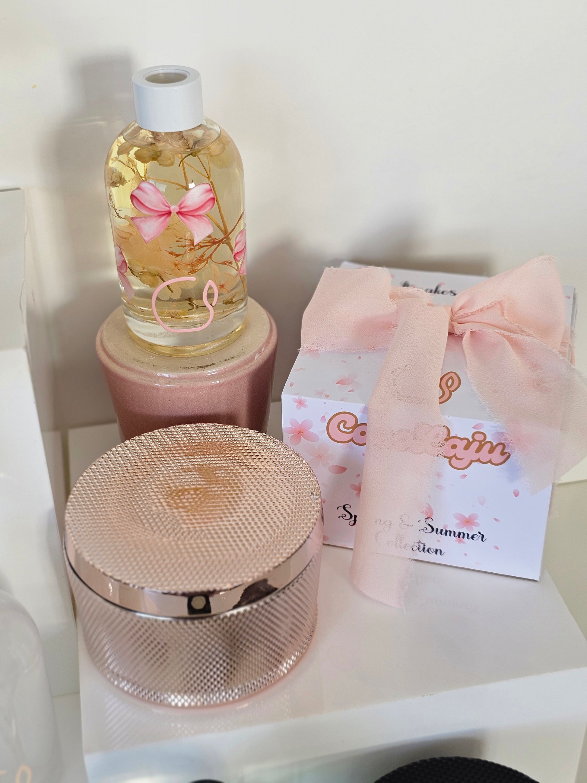 The blushing pink jar with subtle shimmer perfectly complements a diffuser adorned with dry florals and a colorful bow, offering a coordinated scent and style experience for your space.